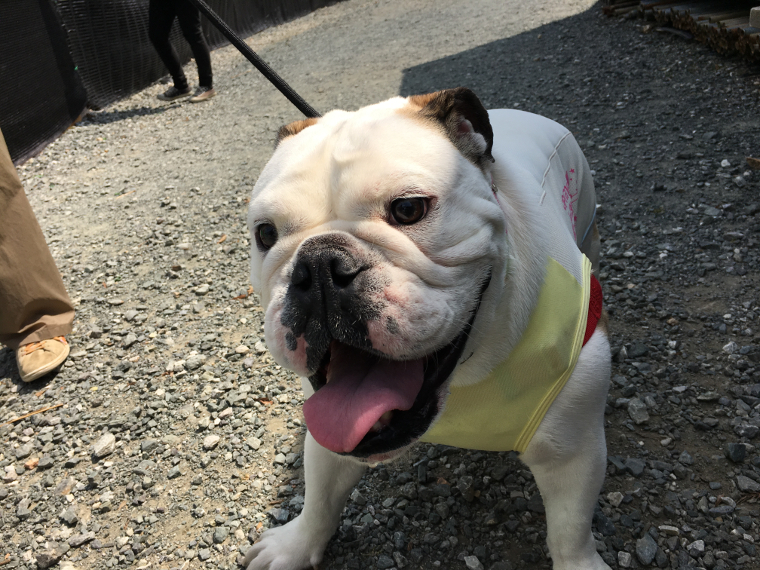 イングリッシュ・ブルドッグの「えびす」さんの保定の様子